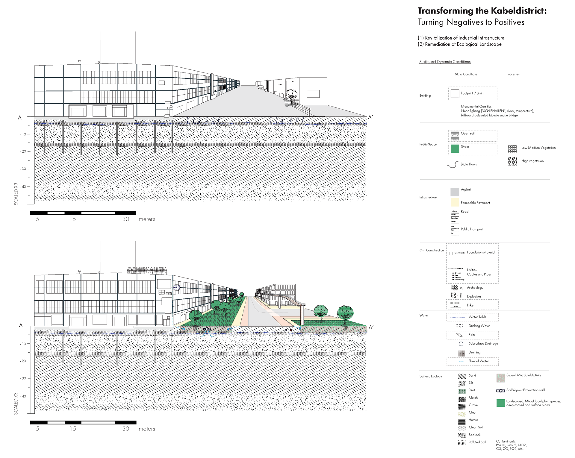 Circulate heat waste from revitalized production facilities and their existing infrastructure + Absorb existing civil systems (such as, pipes, boilers, etc) with the property in exchange for environmental remediation pay-out from seller + Green walls to clean air and large surfaces to collect water run-off to filter contaminants out of soil.
