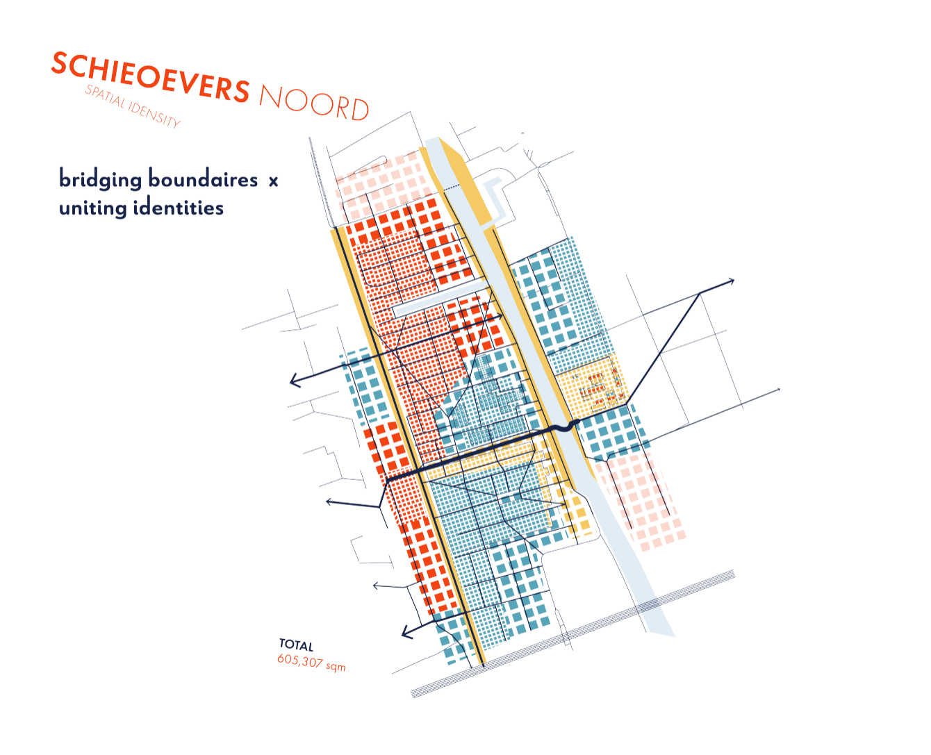 Ease the stressed East-West connections through circular cycle routes to top destinations + Connect fragmented populations and mend disintegrating social landscapes through a shared, inclusive in-between space + Invite diverse demographics and functionalities to share the same socio-spatial identity increasing productivity, collaboration and innovation for all.