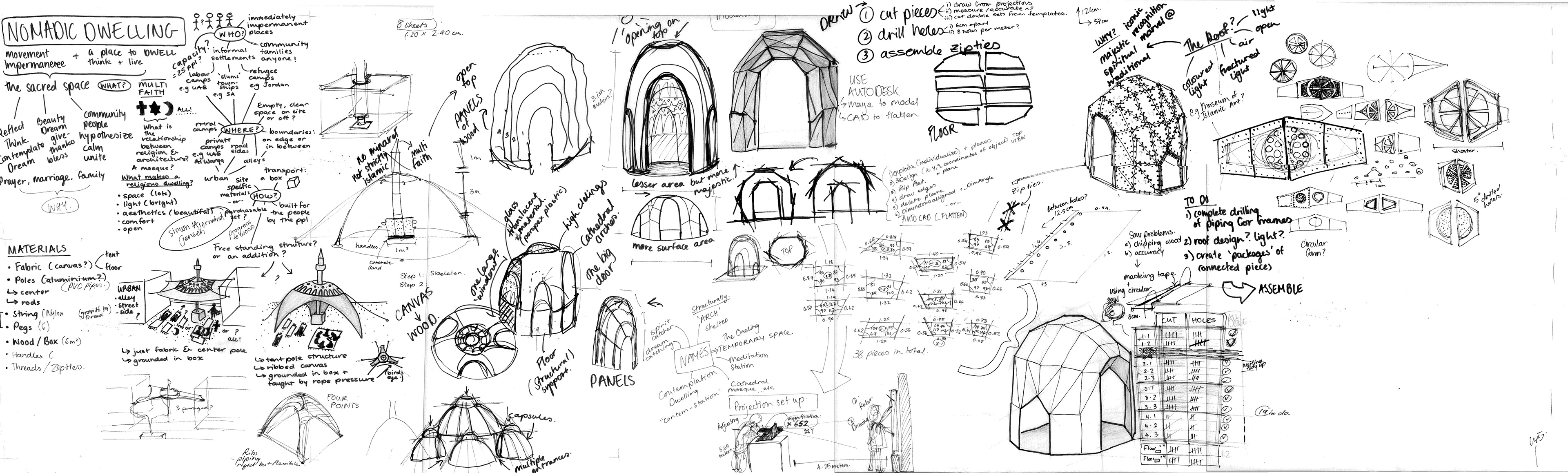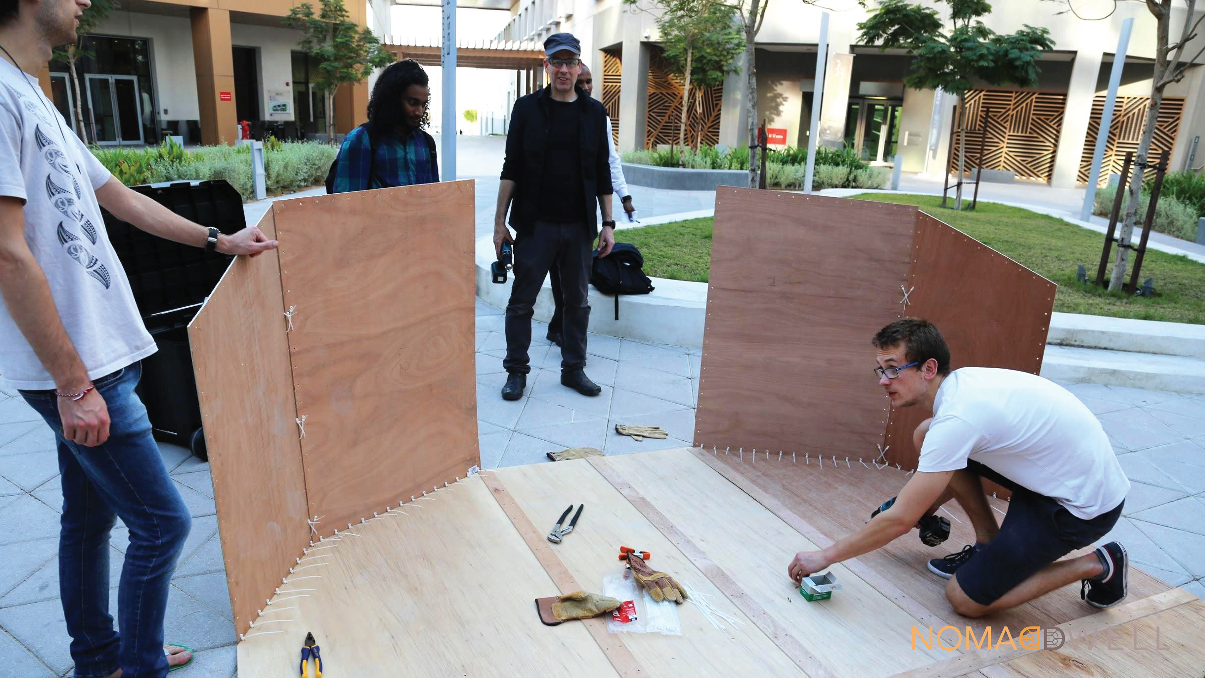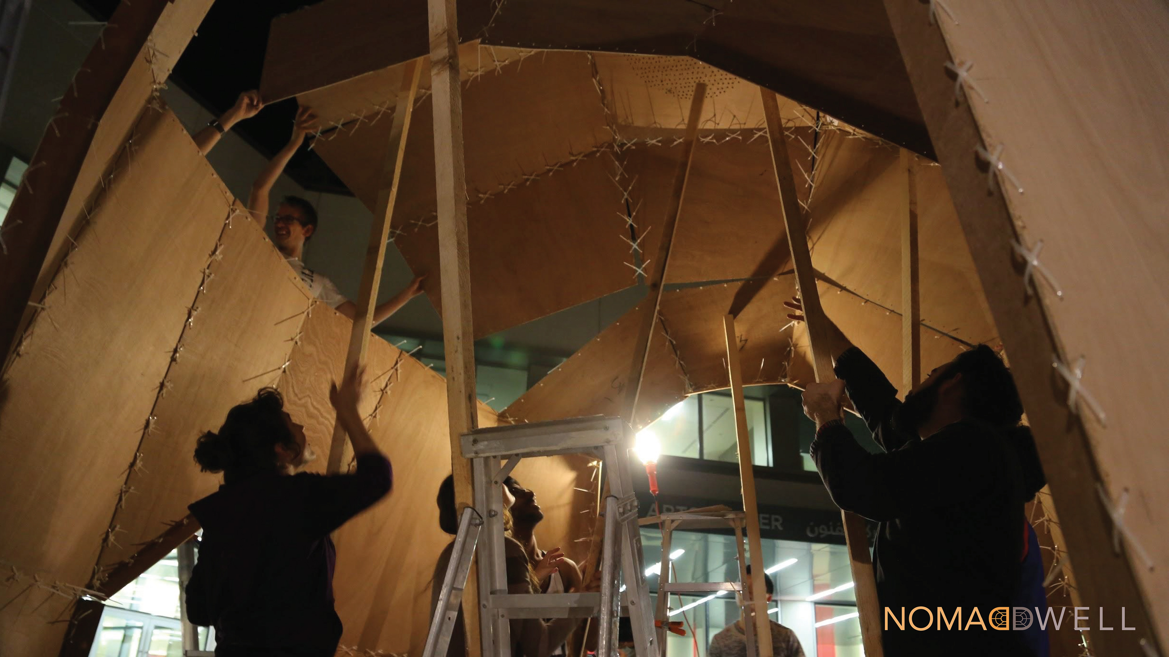 Our class task: to construct a nomadic dwelling prototype in teams of 5. We started by deconstructing the words nomadic and dwelling: temporary, impermanent, transitory, and a place to be, reside, think. Built for those burdened with living in non-permanent places and in need of a space to worship, we prioritise a healthy mentality in these distressing living conditions. NOMADDWELL can provide a safe, open space where people of multiple religions can come and pray peacefully. It combines traditionally sedentary practices of private reflection and public spiritual gatherings with the practical, nomadic aesthetic of community, minimum weight and materials. From conceptual drawings we modelled in Autodesk Maya, projected it 1:1 onto to plywood sheets and hand-cut each plate. These wooden plates were ‘sown’ together with cable ties which allowed for the structures key strength to be its flexibility. It bent and held in the extremely harsh weather conditions of the Gulf for over a year. We were honored to be shortlisted for the Jeanne-Claude Christo Award and travel to Italy for this project.