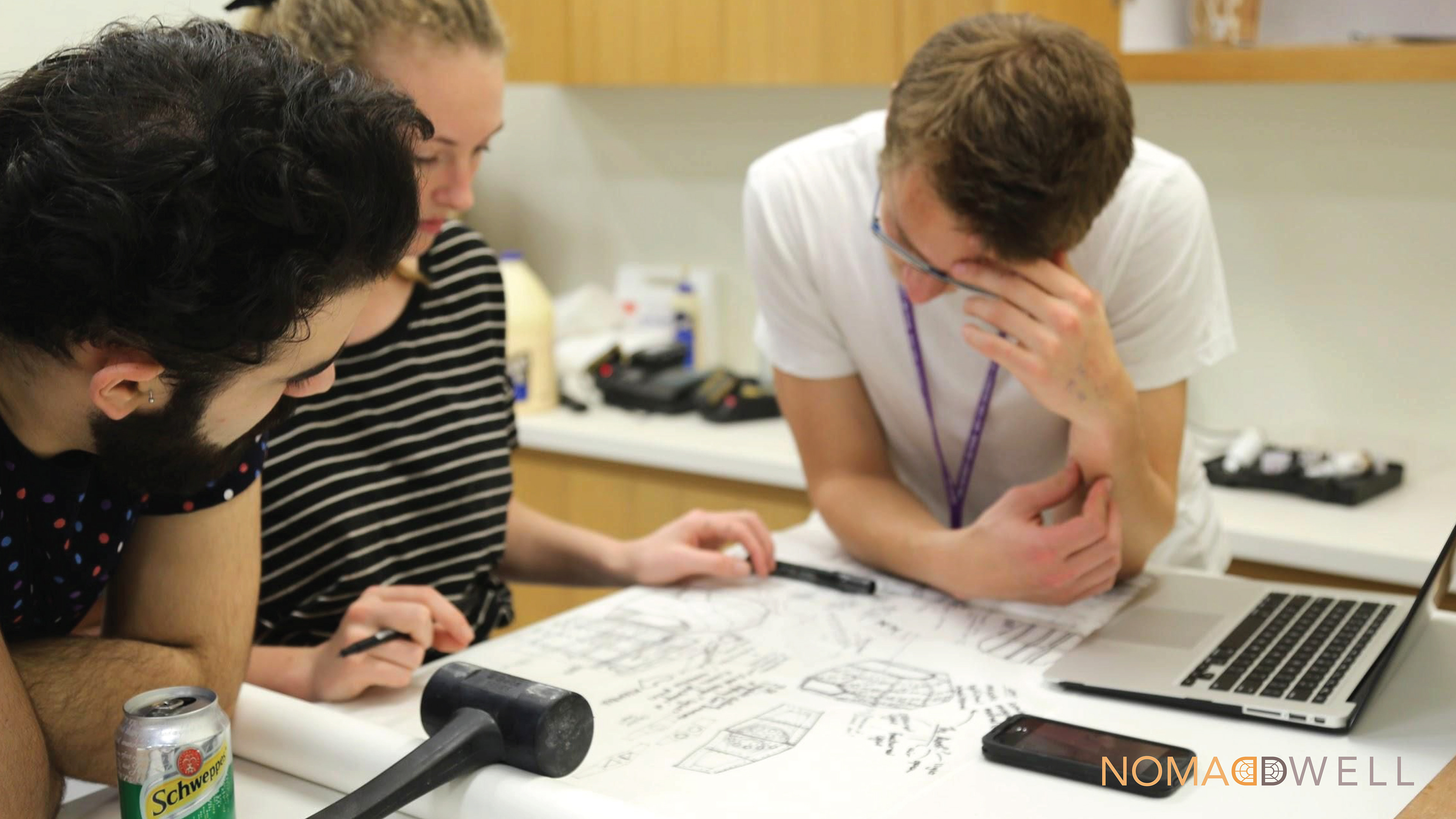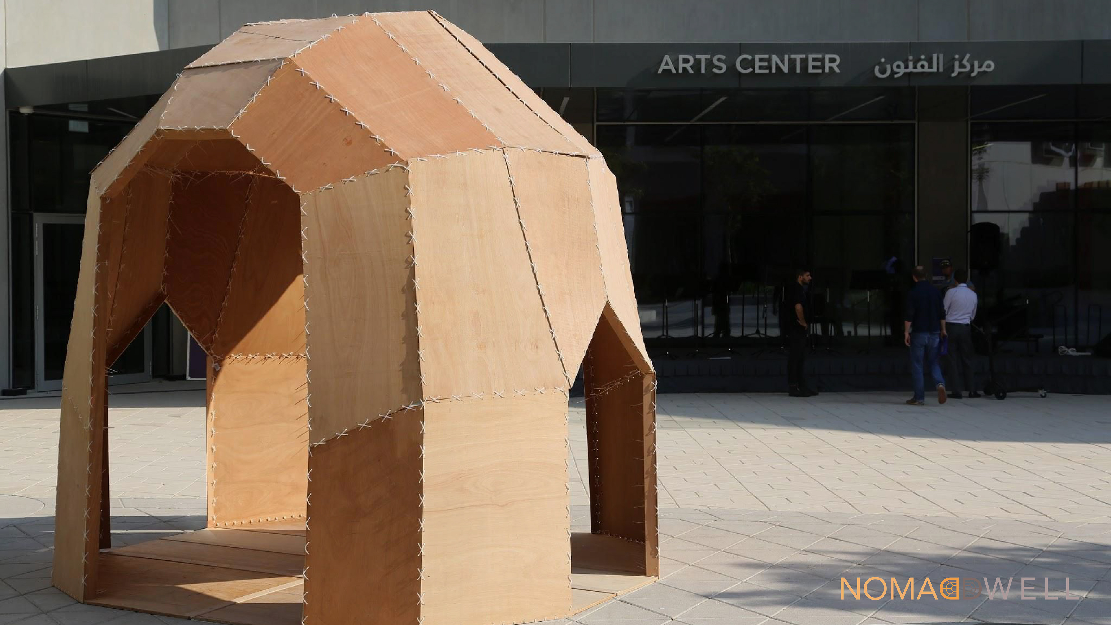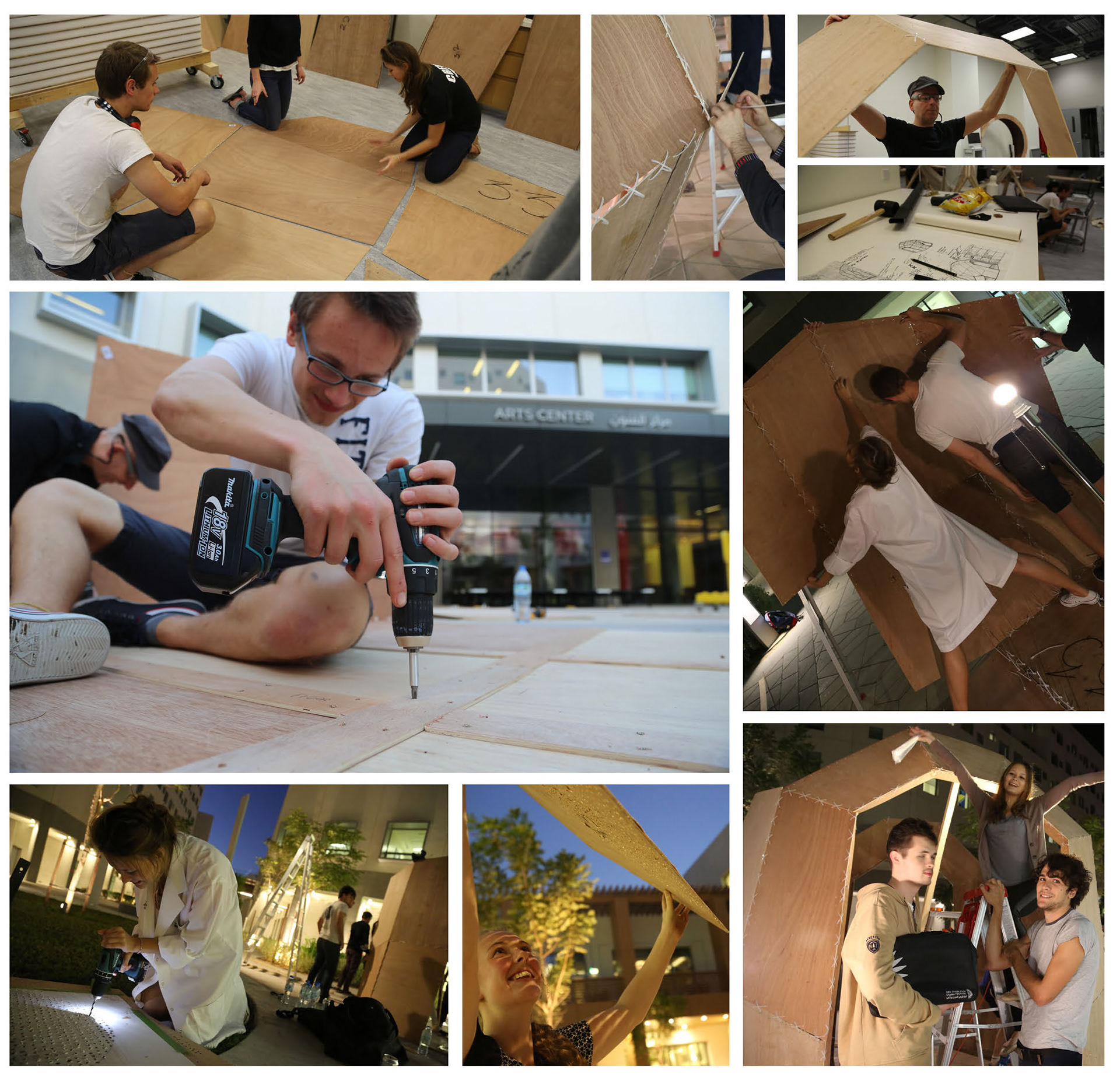 Our class task: to construct a nomadic dwelling prototype in teams of 5. We started by deconstructing the words nomadic and dwelling: temporary, impermanent, transitory, and a place to be, reside, think. Built for those burdened with living in non-permanent places and in need of a space to worship, we prioritise a healthy mentality in these distressing living conditions. NOMADDWELL can provide a safe, open space where people of multiple religions can come and pray peacefully. It combines traditionally sedentary practices of private reflection and public spiritual gatherings with the practical, nomadic aesthetic of community, minimum weight and materials. From conceptual drawings we modelled in Autodesk Maya, projected it 1:1 onto to plywood sheets and hand-cut each plate. These wooden plates were ‘sown’ together with cable ties which allowed for the structures key strength to be its flexibility. It bent and held in the extremely harsh weather conditions of the Gulf for over a year. We were honored to be shortlisted for the Jeanne-Claude Christo Award and travel to Italy for this project.